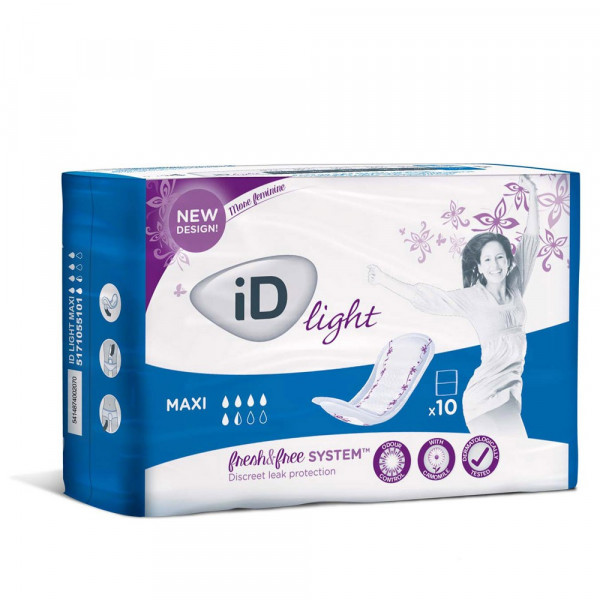 Avec son tampon super-absorbant (d'une capacité de rétention de 800 ml) qui absorbe les fuites, neutralise les mauvaises odeurs et maintien la peau sèche et douce ; la protection Ontex-ID Light Maxi est bien adaptée à une utilisation de jour comme de nuit en cas d'incontinence modérée de la femme.